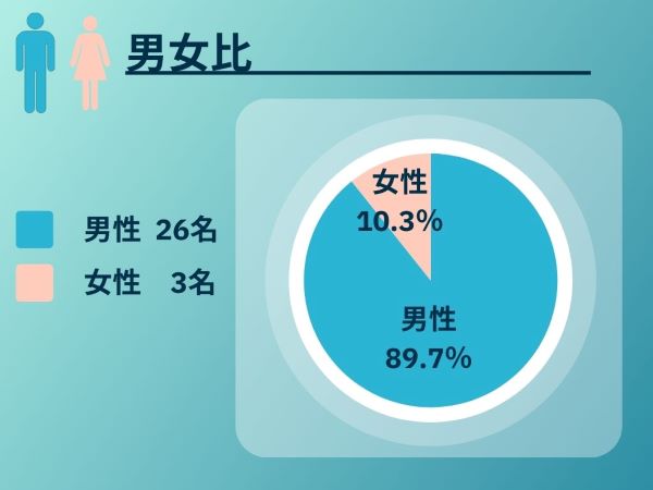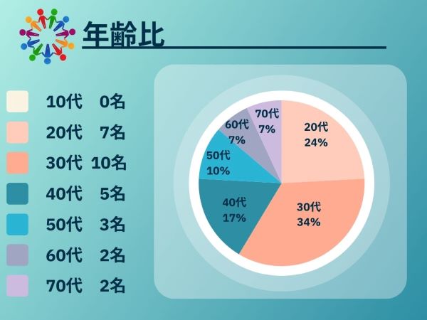 若手である20代~30代の人数が比較的多いですが、70代までの各年代の社員が満遍なく在籍しています。